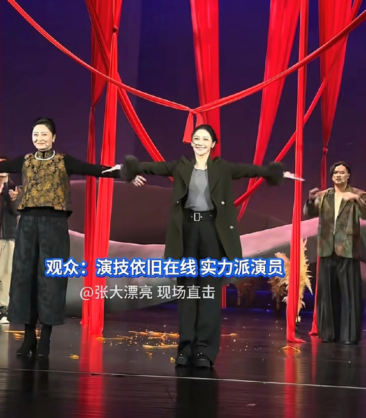这次在话剧《新.孔雀东南飞》里,姚笛饰演重要角色焦母,剧中穿着深蓝民国棉麻演出服搭黑色裤子,整个人的表演很卖力,比起去年试图复出上综艺时的落寞黯淡,状态看着好多了。